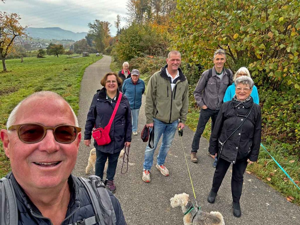 Am Sonntagmorgen, 19. Oktober 2025, trafen sich 8 Wanderer mit 5 Lakies und Myla an der Tramhaltestelle Ettingen Dorf zum Bummel nach Flüh. In gemütlichem Tempo schlenderten wir durch Ettingen und dann dem Waldrand von Bättwil entlang zum Ziel Osteria Landskron in Ettingen. Die Hunde genossen das Rumschnüffeln und die Teilnehmer den regen Austausch unterwegs.